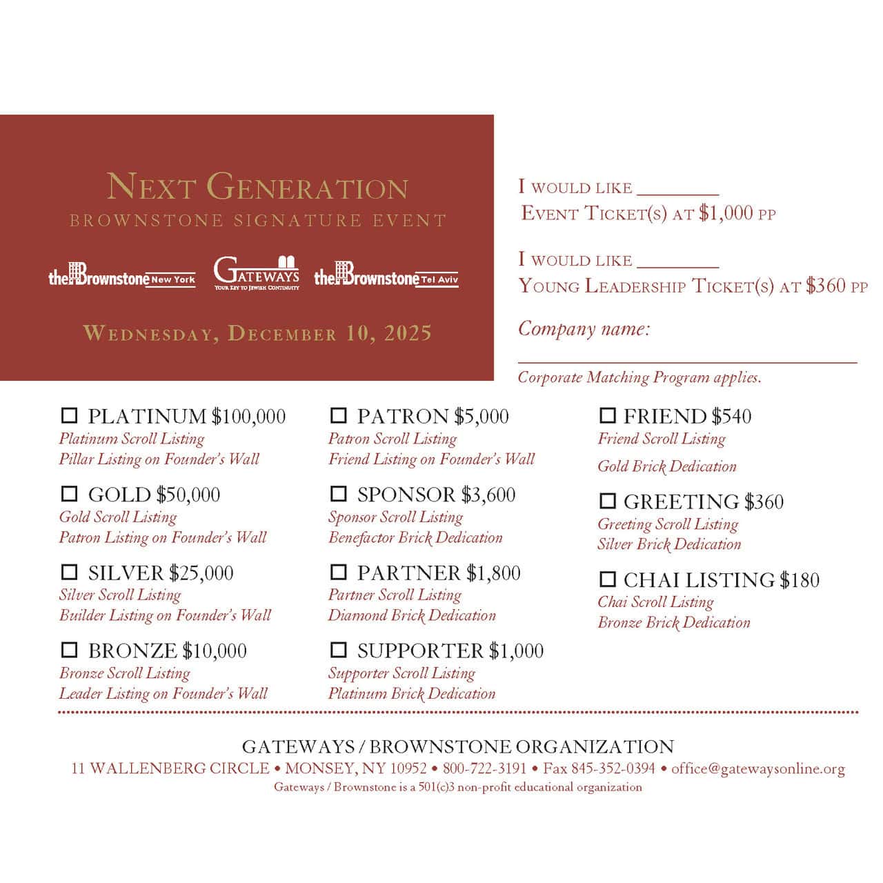 Please click on the item you would like to donate Young Leadership Ticket $360.00 Add to cartContinue Loading Done Scroll Listing $180.00 – $100,000.00Price range: $180.00 through $100,000.00 Select optionsContinue Loading Done This product has multiple variants. The options may be chosen on the product page Event Tickets $1,000.00 Add to cartContinue Loading Done